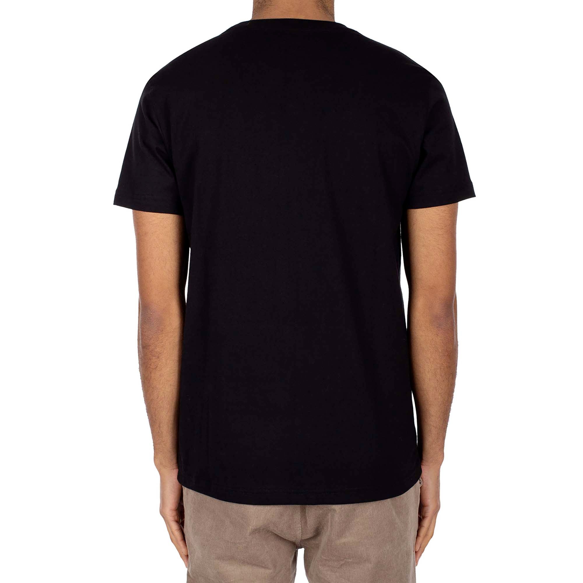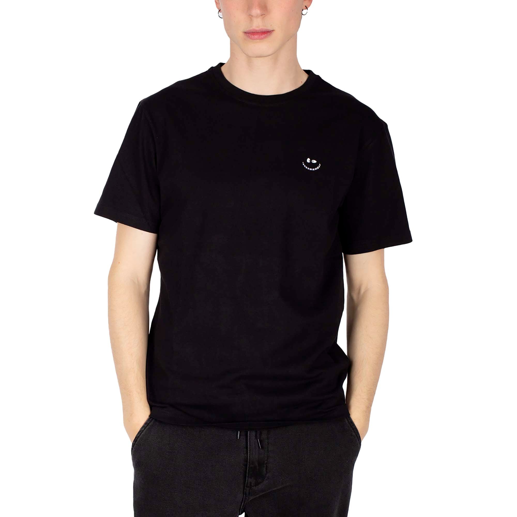 Details : Black cotton T-shirt with a small, stylized smile embroidery on the chest for a distinctive, ironic touch. Clean lines and soft fabric for everyday comfort.