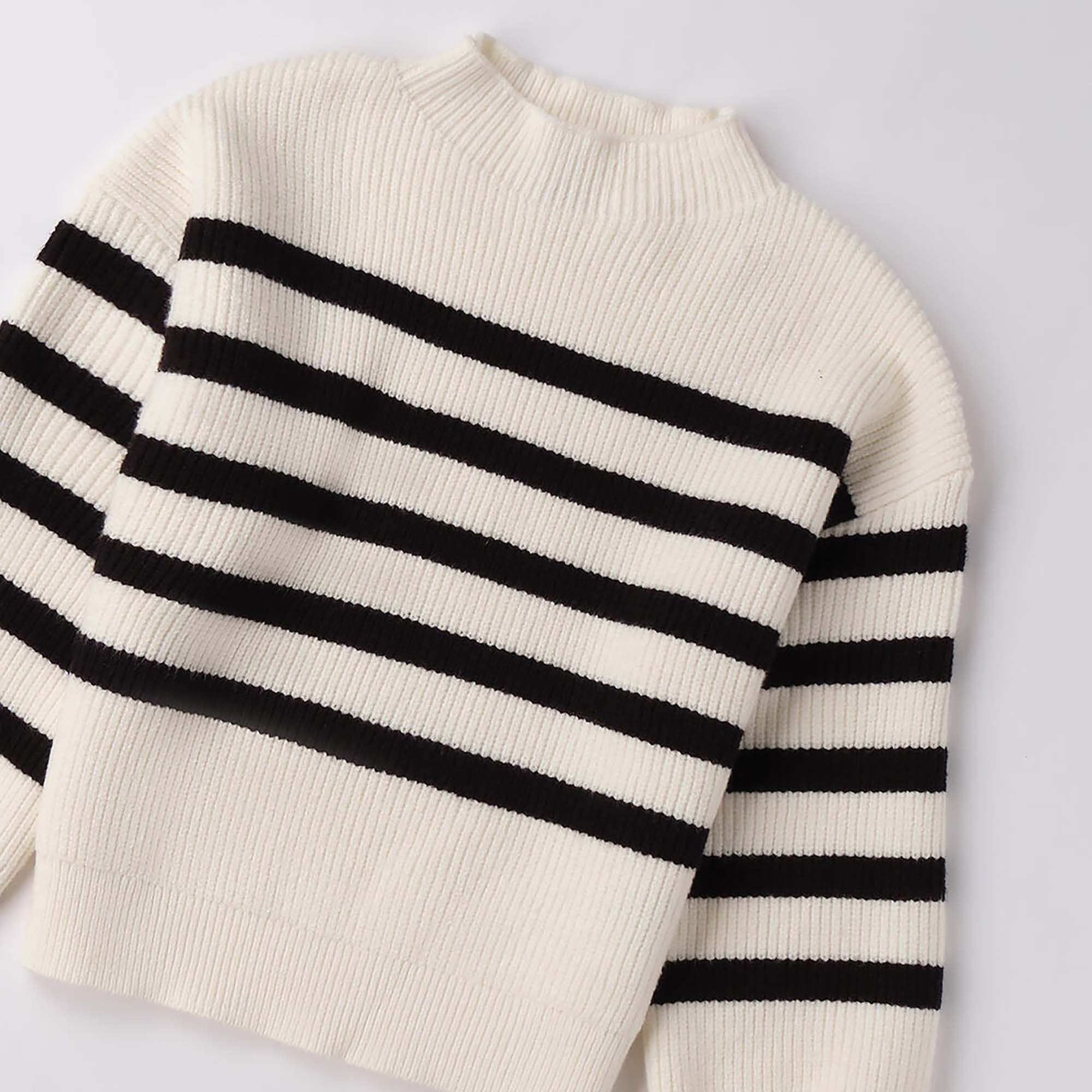 Details : iDO sweater for girls aged 8-16 years made of striped stretch tricot. Soft and comfortable, with a black striped pattern on a light background and slightly wide sleeves for a modern look.